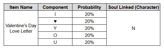 When you use a Valentine’s Day Love Letter, you will randomly receive one of five special letters, based on a set probability.