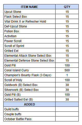 - Guild Rally Only items : Guild Raffle Ticket + Guild Bracelet ticket + Guild Light Stick for each guild