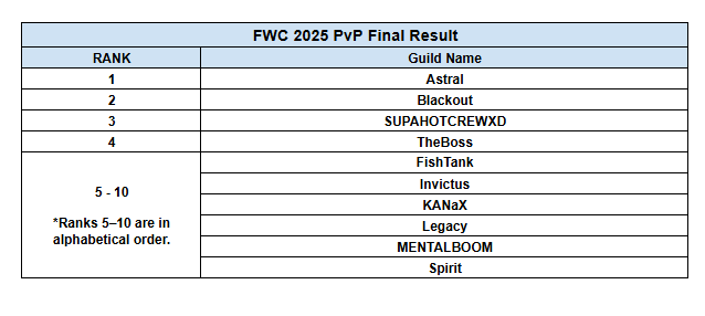Here are our Top 10 for the FWC 2025 PvP Event: