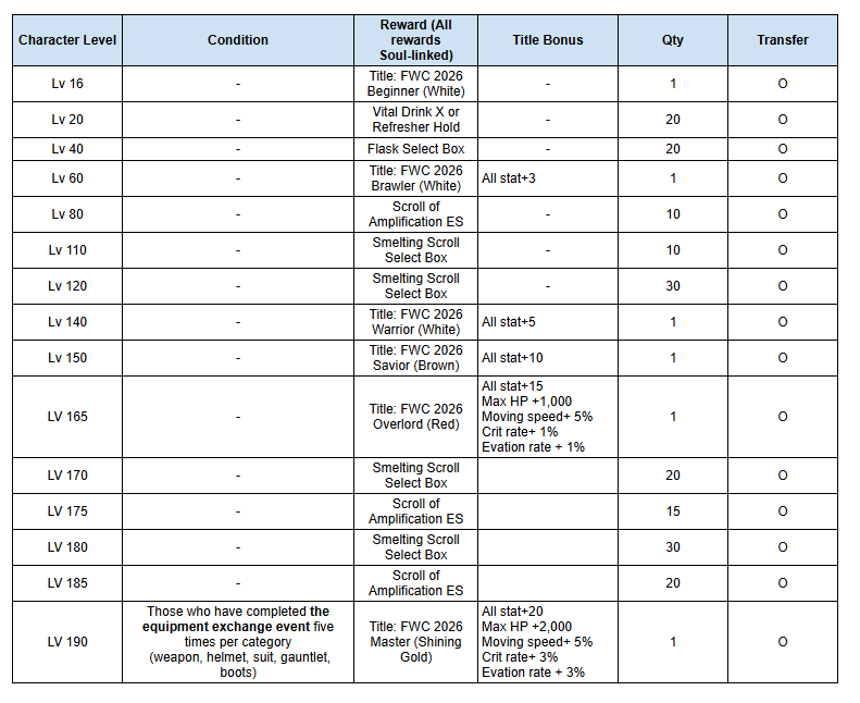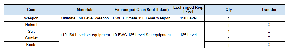 Also, please note that the FWC Equipment exchange event-related transferable items such as equipment and weapons, will be converted to be Account-linked when you transfer your character later on. We will be making a more detailed announcement about the transfer process on a later date.