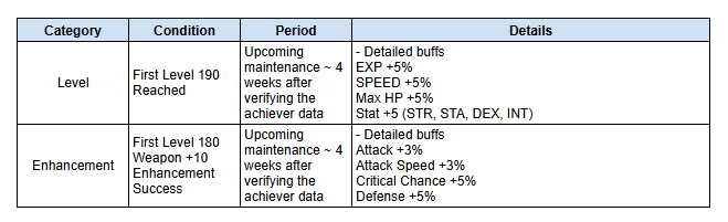 To celebrate the first player to reach Level 190, statues featuring their character appearance and name will be placed in each town. Clicking the statue grants the following buffs for 30 minutes, in addition to the player's existing buffs.