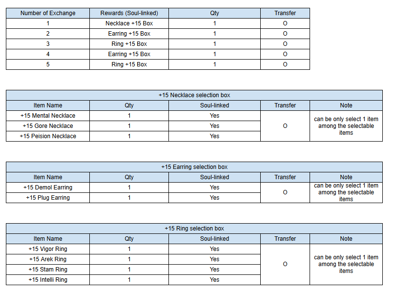 Please note that exchanges are limited once per character for each piece of equipment, except for Blade classes, where they can exchange 2 weapons.