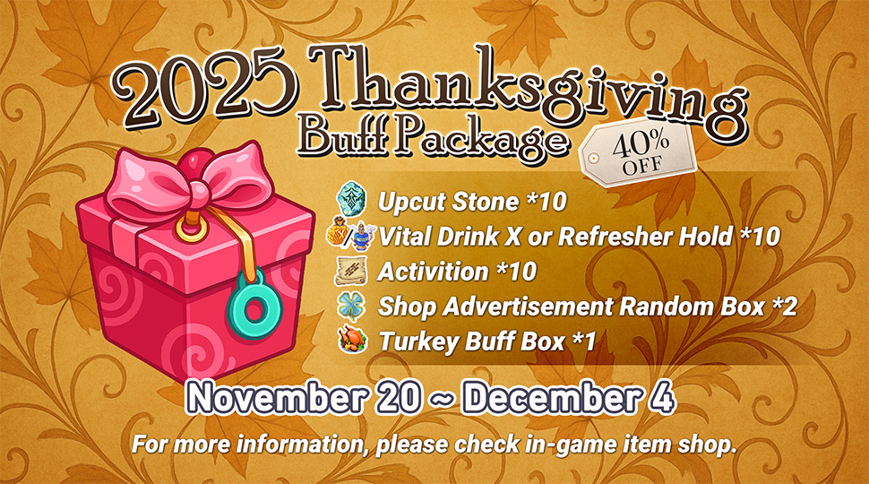 The special package, "2025 Thanksgiving Buff Package", will provide multiple discounts for valuable items for a limited time.