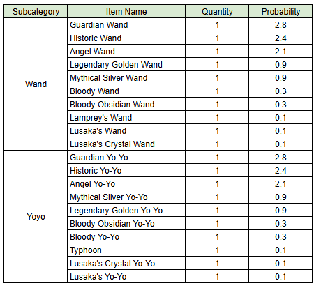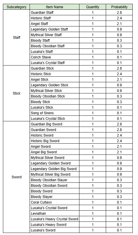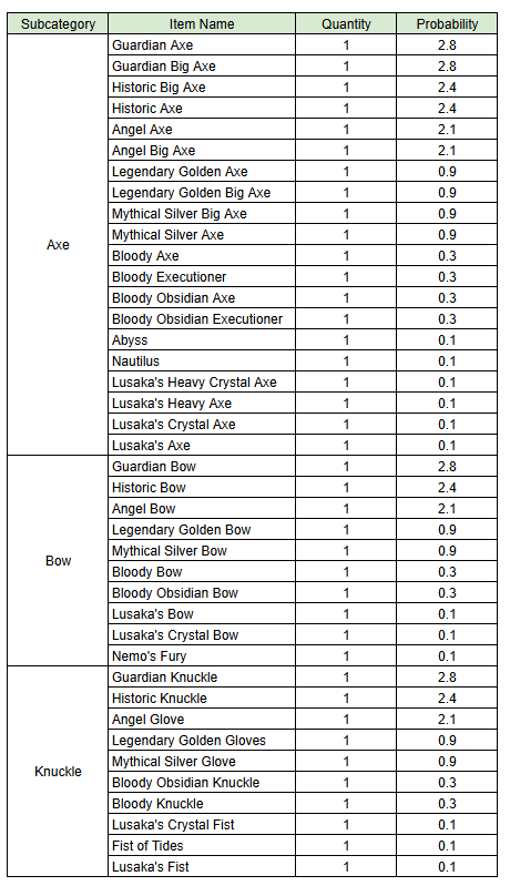 Check out the Unique Weapon Random Box probabilities below. Keep in mind that it can drop weapons for any class, so you might receive one that doesn’t match your class or level.
